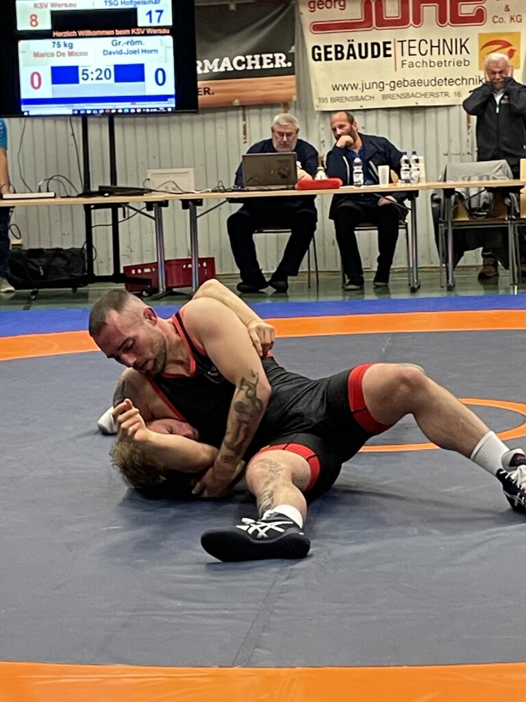 Den Auftakt setzte Sevket Ermis (57 kg Griechisch-Römischer Stil). Mit explosiver Präsenz überrollte er seinen Gegner Mihail Tomas regelrecht und schulterte ihn noch vor der ersten Minute. Ein emotionaler Start, der die Halle sofort zum Kochen brachte. Im Schwergewicht stellte sich Samar Ahmad Tahir (130 kg Freistil) dem erfahrenen Christian Schäfer mutig entgegen. Trotz einer frühen Serie an schnellen Aktionen des Gastes gab Tahir nie auf. Die Niederlage durch technische Überlegenheit schmerzte, doch sein Einsatz blieb ungebrochen. In der 61-kg-Klasse kämpfte Faris Ahmatovic seinen ersten Kampf überhaupt mit viel Tempo. Nach zwei mutigen Angriffen holte er seine Punkte, ehe sein Gegner nach einer knappen Minute eine Chance nutzte und Faris auf die Schultern brachte. Auch Chris Reimund (98 kg GR) kämpfte tapfer, musste aber gegen seinen starken Kontrahenten eine frühe Schulterniederlage hinnehmen. Mit 4:12 ging es in die Pause – doch Wersau blieb dran. Nach der Pause sorgte Fabio Beer (66 kg GR) für ein echtes Stimmungsbeben. In einem intensiven, langen Kampf drehte er mehrfach Rückstände mit kapitalen Schwunggriffen. Sein Gegner Damian Alberg musste schließlich aufgeben, da eine Blutung auch nach vier Minuten nicht gestillt werden konnte. Ein Sieg voller Wille. Im Anschluss zeigte Daniel Seibold (86 kg FS) viel Initiative. Zwei sauber herausgearbeitete Beinangriffe brachten ihn nach vorne, doch Dmytro Hubanov konterte spät und gewann schließlich auf Schulter. Über sechs Minuten lang lieferte Deni Gadaev (71 kg FS) einen harten, taktisch geprägten Fight. Beide punkteten verteilt, kleine Fehler entschieden – am Ende verlor Gadaev knapp mit 1:3. Den Schlusspunkt setzte Marco De Micco (75 kg GR), der seinen Gegner Horn nach 54 Sekunden schultern konnte. Ein Abschluss, der noch einmal Mut machte.